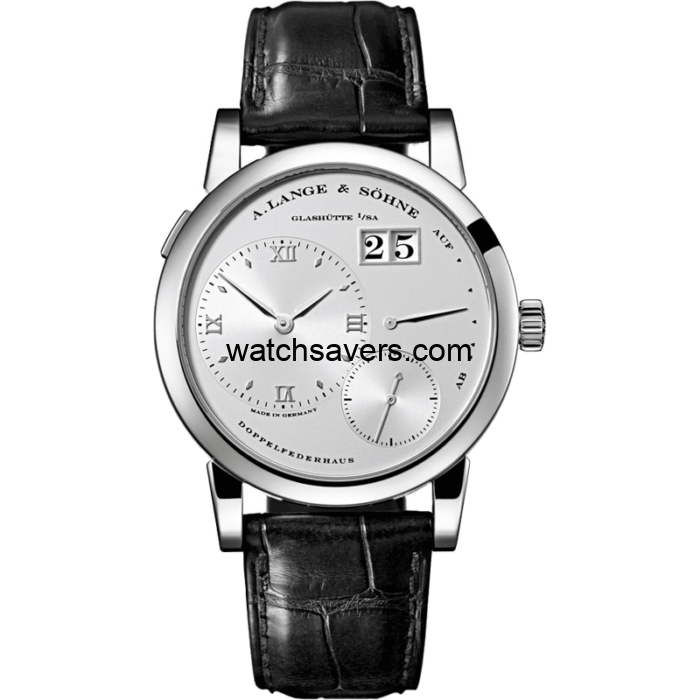 The ref. 101.025 Lange 1 has a platinum case and a silver / grey dial.