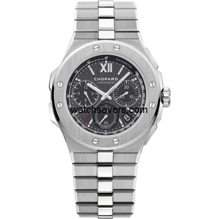 The Chopard Alpine Eagle XL Chronograph reference [WATCH_REF} has a case made of ‘Lucent’ steel, which houses caliber Chopard 03.05-C, a self-winding movement with chronograph and date. The dial is Black.