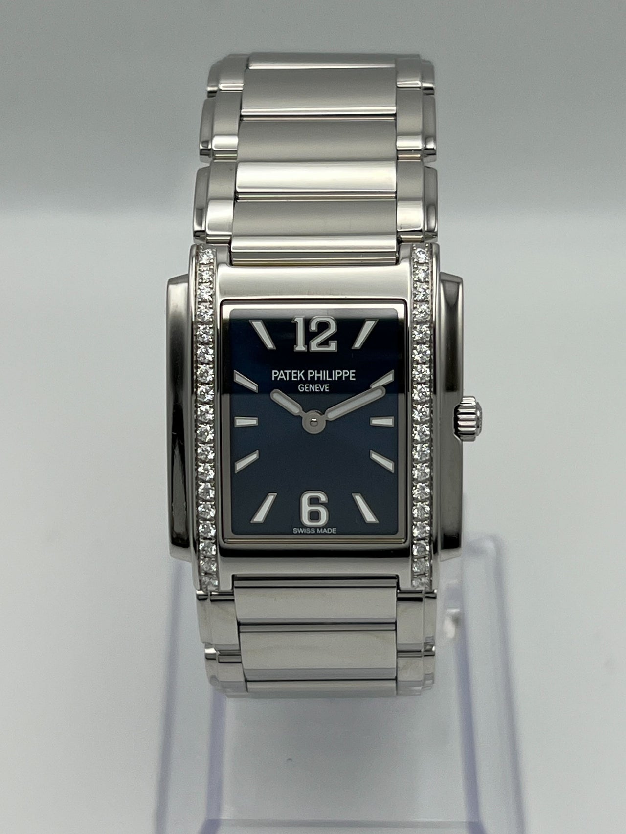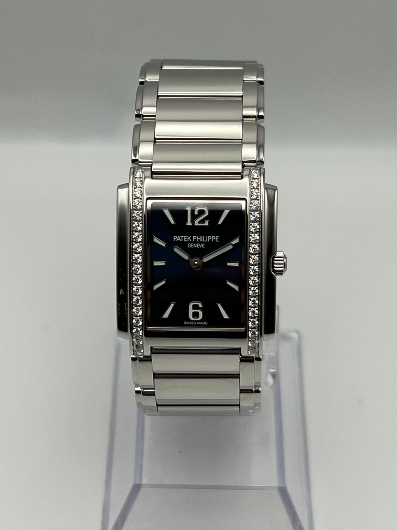 Patek Philippe's "Twenty~4" collection is a series of women's watches that blend elegance and high-class craftsmanship. Launched in 1999, this collection was designed to cater to the modern female lifestyle, offering wristwatches that are both sophisticated and suitable for everyday wear. These watches are characterized by a rectangular design with a decorative crown on the side and a combination of precious materials, including stainless steel and rose gold. Dials are often embellished with diamonds, adding a touch of luxury. The Twenty~4 collection was inspired by the concept of "24 hours of style," offering the opportunity to wear a luxury watch at any time of the day.