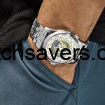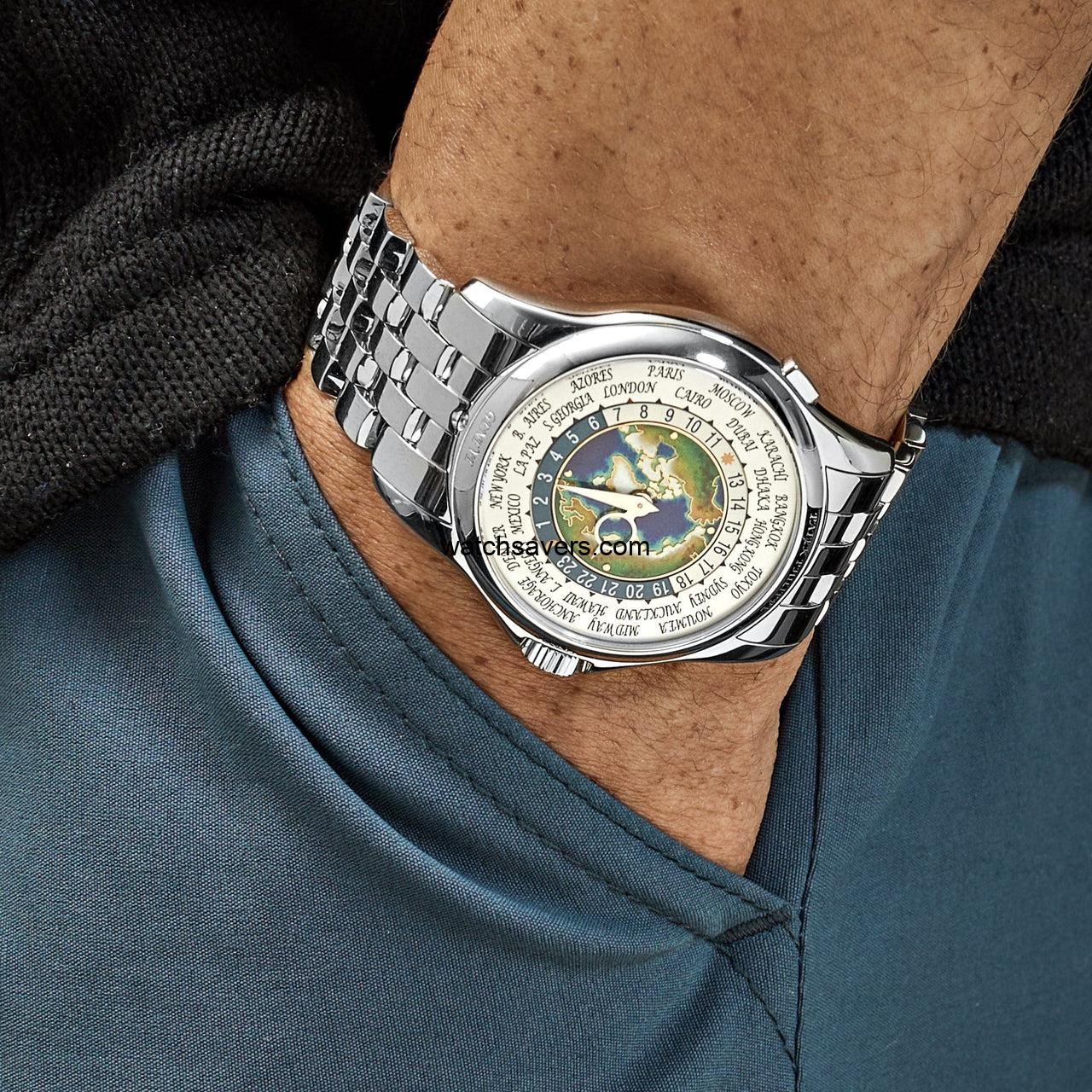 The Patek Philippe World Time 5131/1P-001 was introduced at BaselWorld 2017. It features a platinum case and matching bracelet, while the cloisonnรฉ enamel dial shows the earth with the North Pole as the center.