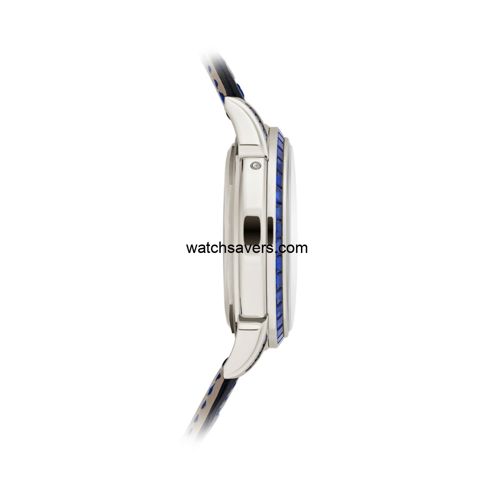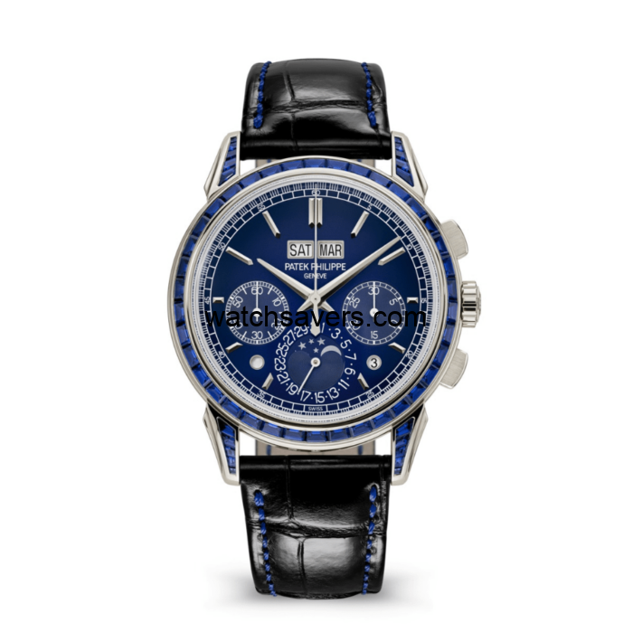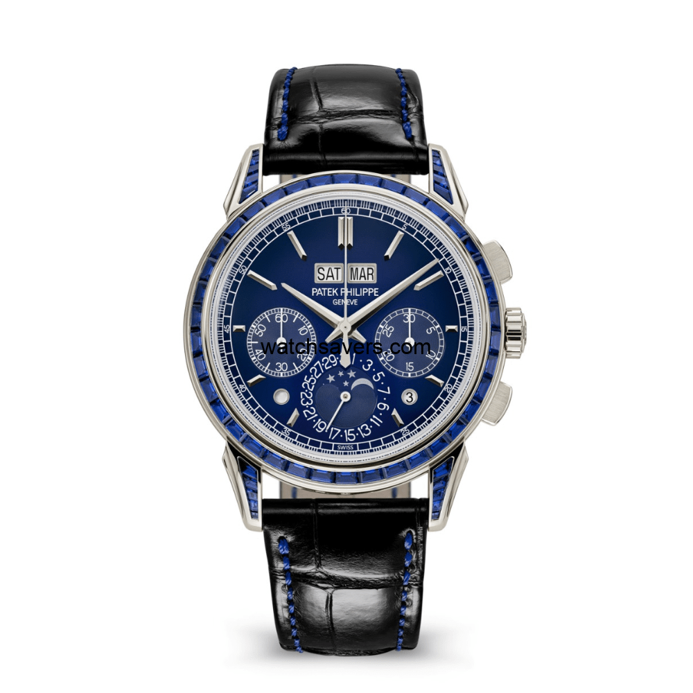 The Patek Philippe Perpetual Calendar Chronograph 5271/11P-010 made its debut in 2022. This watch is set with a total of 80 baguette-cut sapphires (5.16 cts) across its case and folding clasp. The dial is Blue.