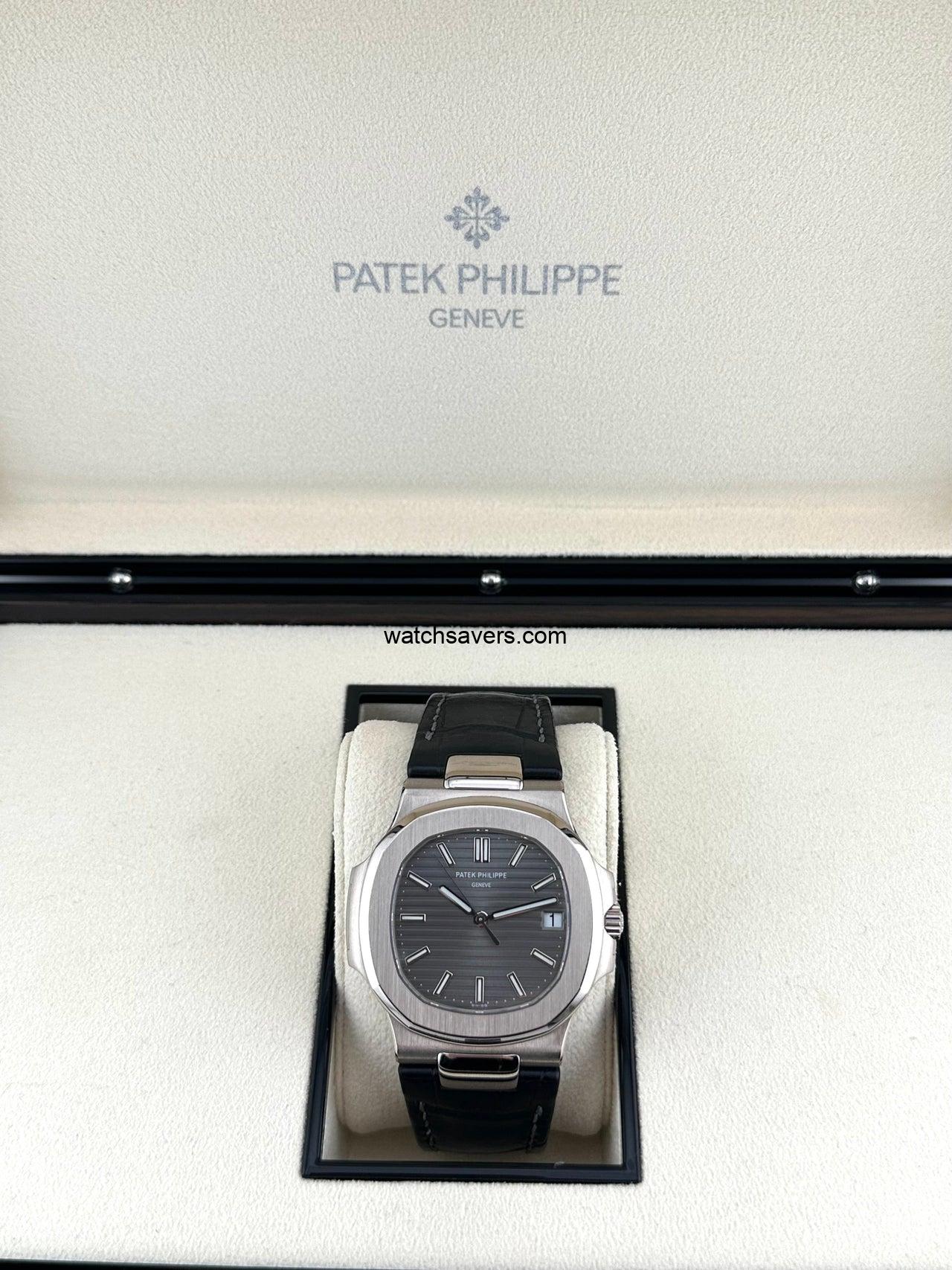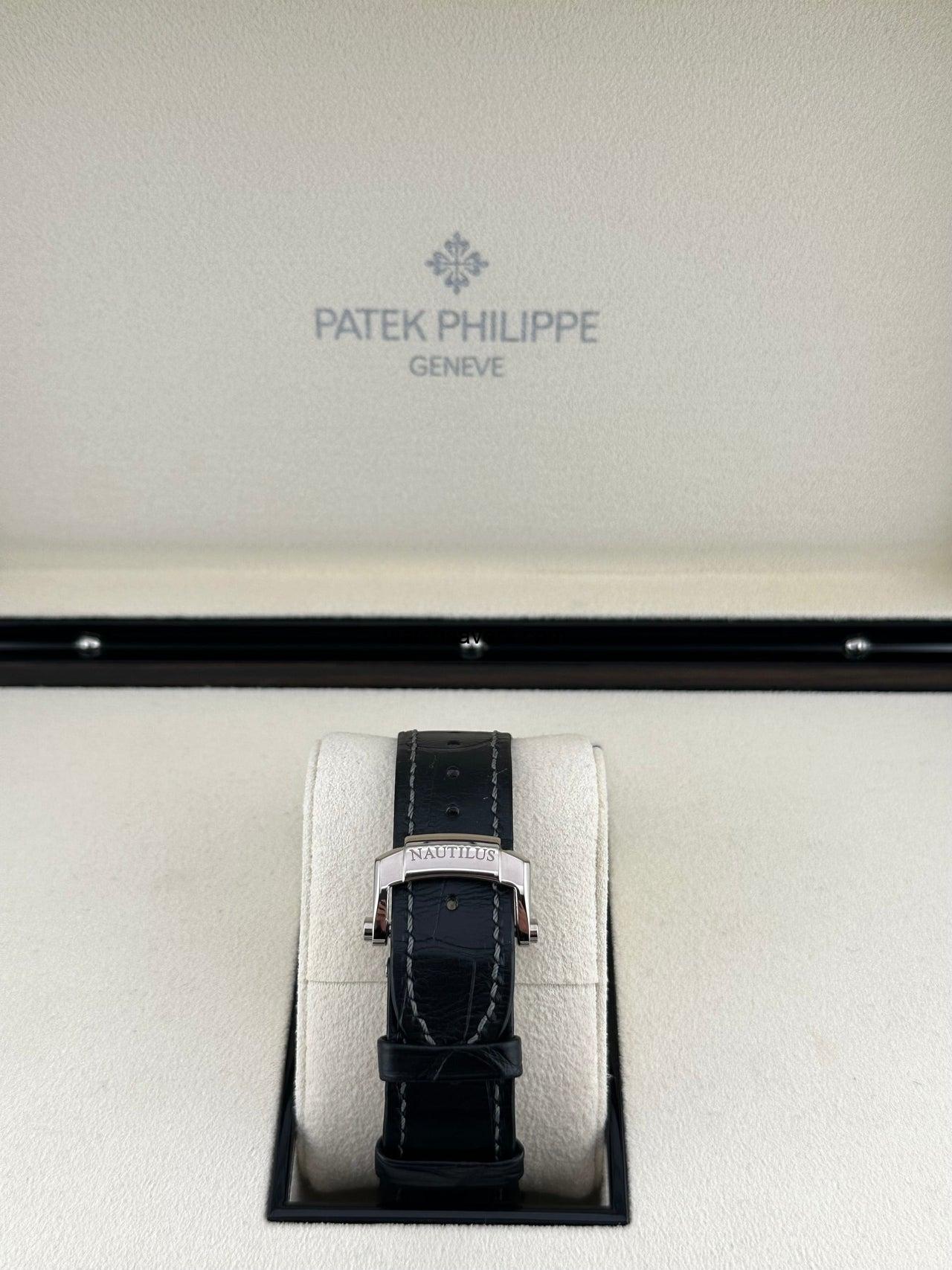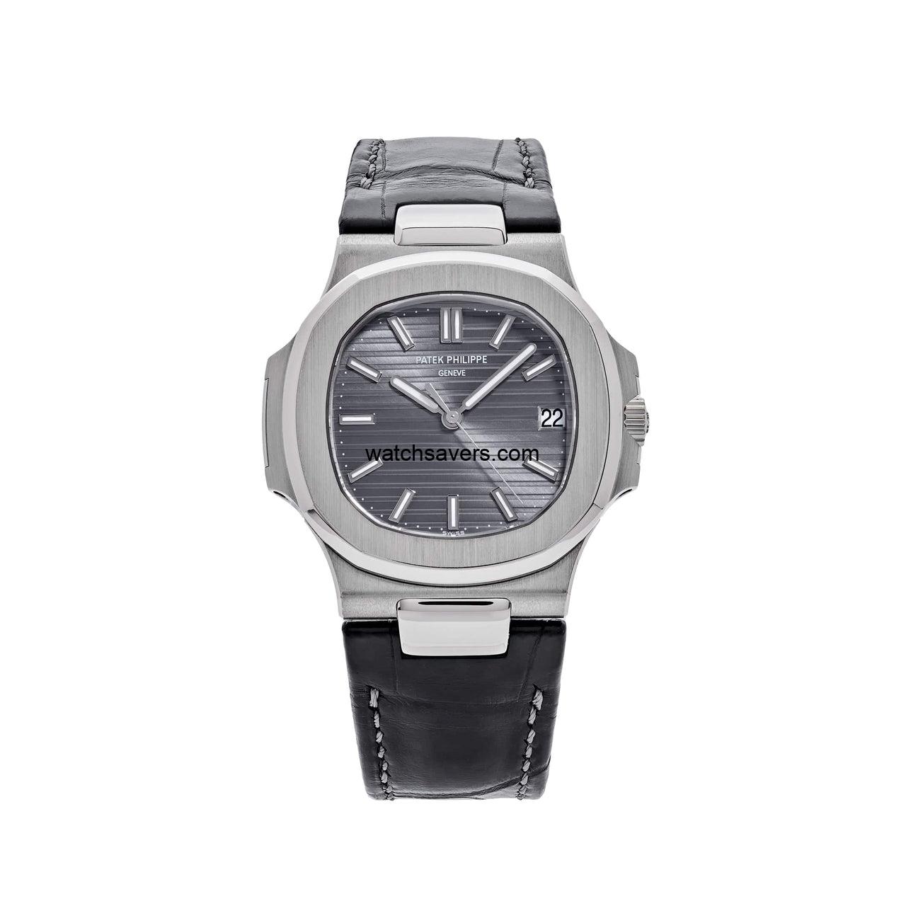 The Patek Philippe Nautilus 5711G-001 has a white gold case and an alligator strap.
