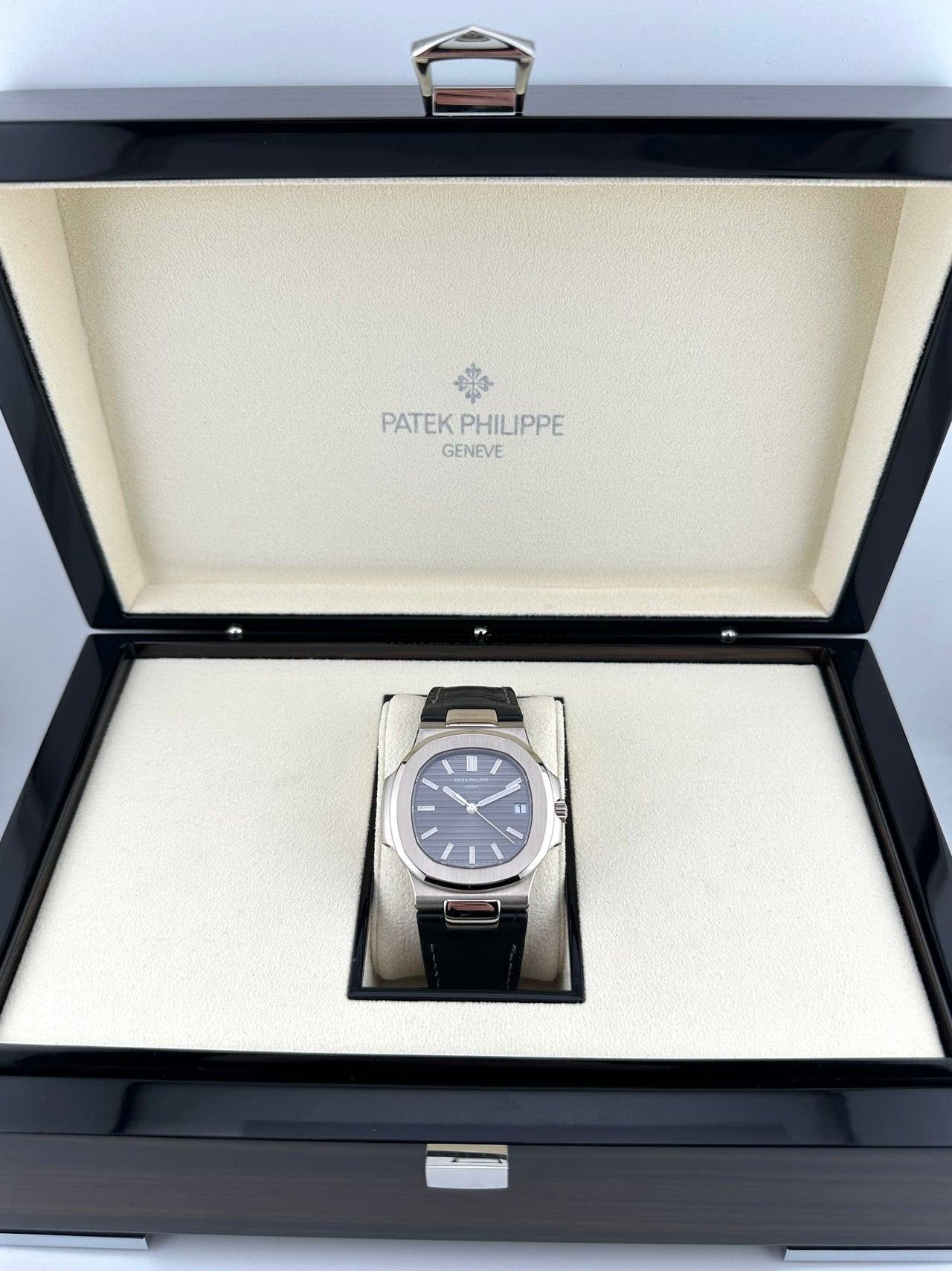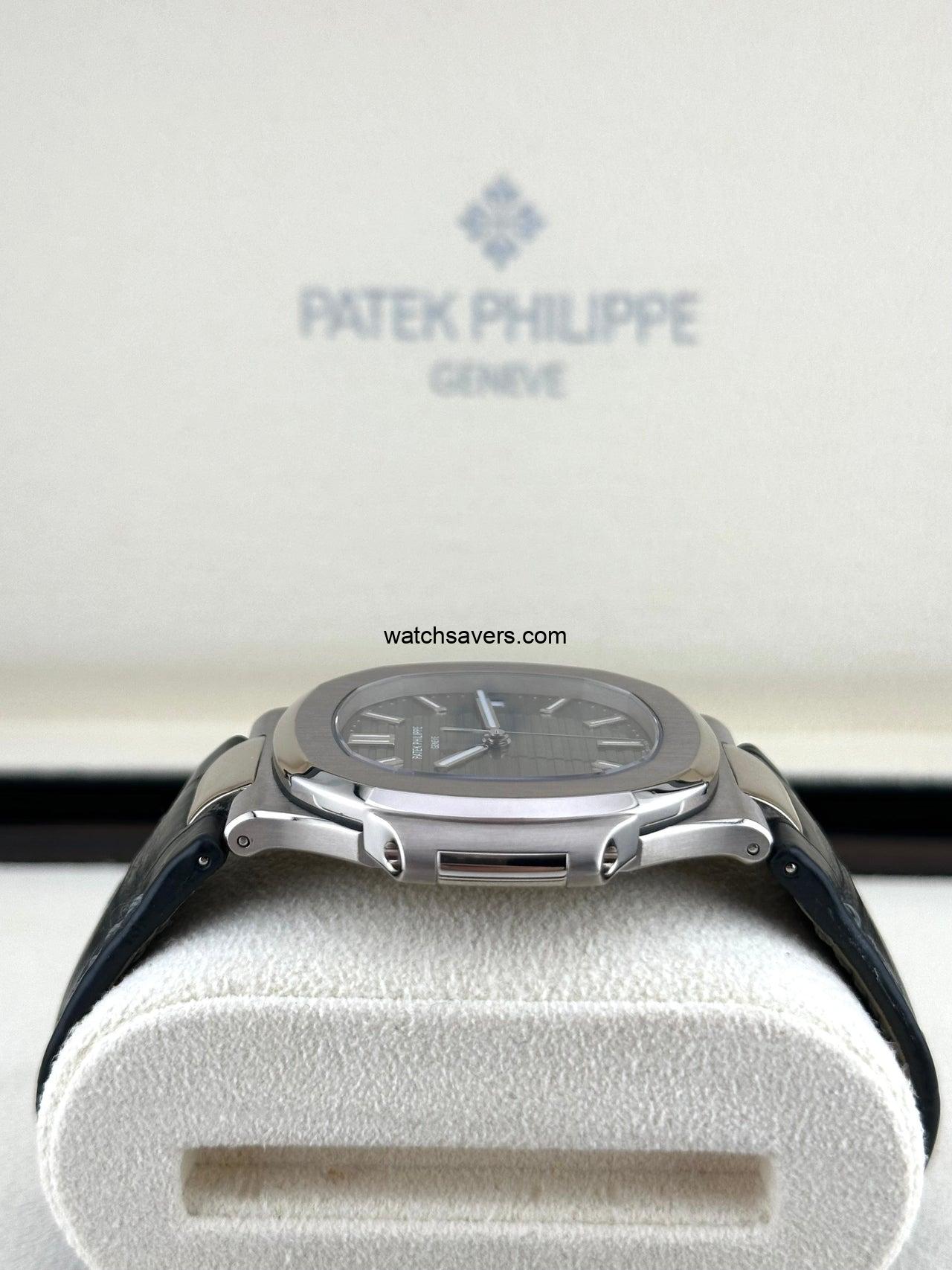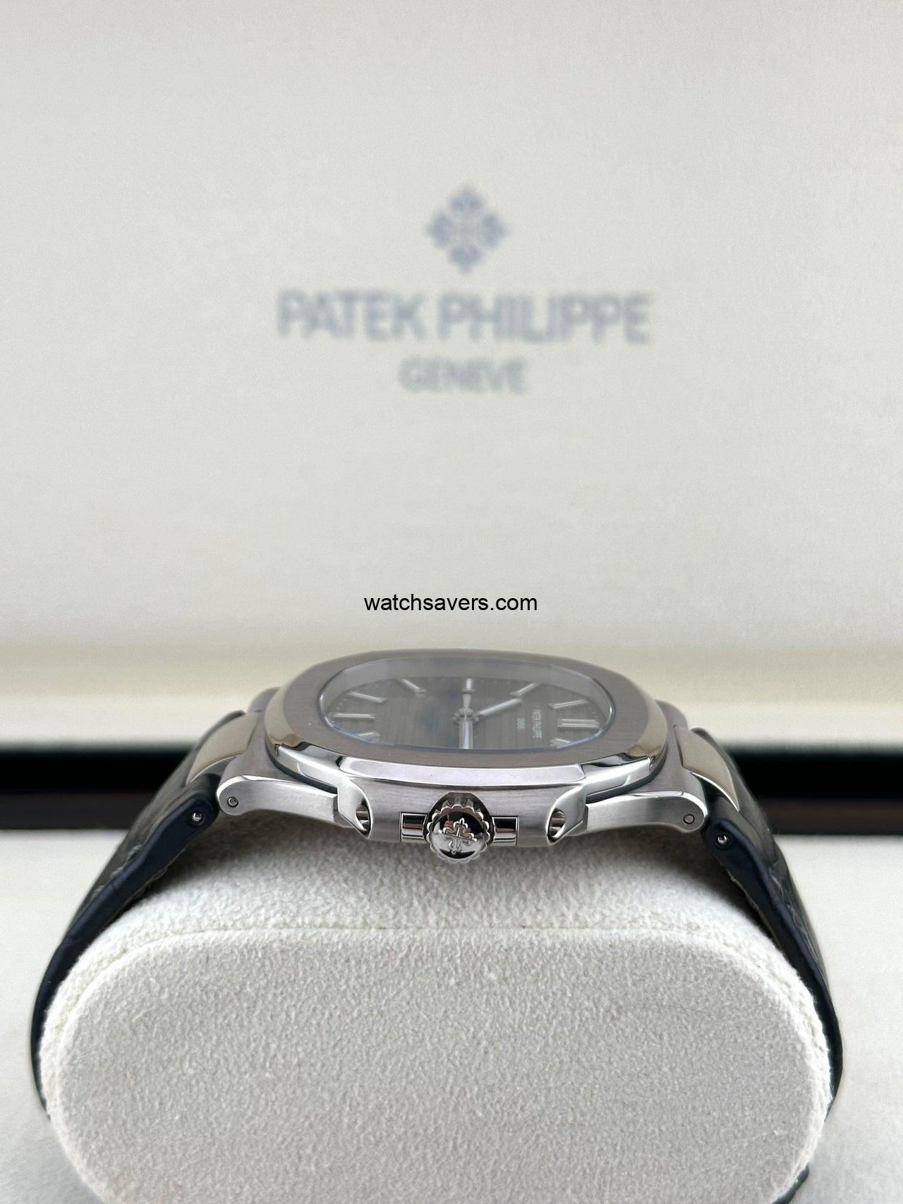 The Patek Philippe Nautilus 5711G-001 has a white gold case and an alligator strap.