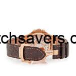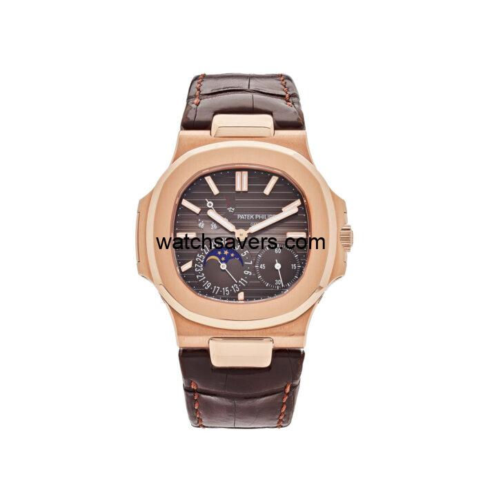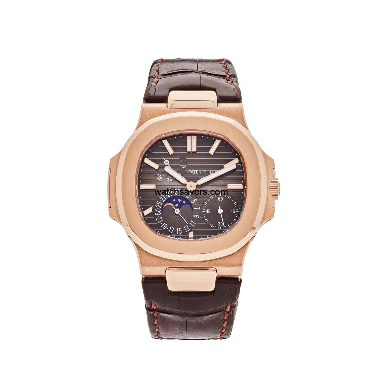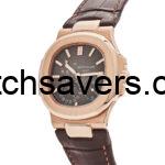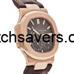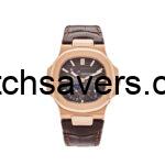 The Nautilus 5712R-001 is fitted with a rose gold case and a brown dial. It is fitted with an alligator strap.