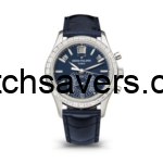 Introduced at BaselWorld 2011, the 5961P-001 features a bezel set with 36 baguette diamonds (~3.48 ct.). and a The matte blue dial features 8 diamond hour markers (~0.23 ct.), while the fold-over clasp is set with 22 baguette diamonds (~0.97 ct.).