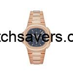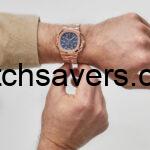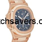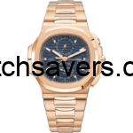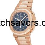 The Patek Philippe Nautilus Travel Time reference 5990/1R-001 has a Rose Gold case and matching bracelet. The dial is Blue. Inside ticks the brand’s self-winding caliber CH 28-520 C FUS movement, which features a flyback chronograph, second time zone, and date.