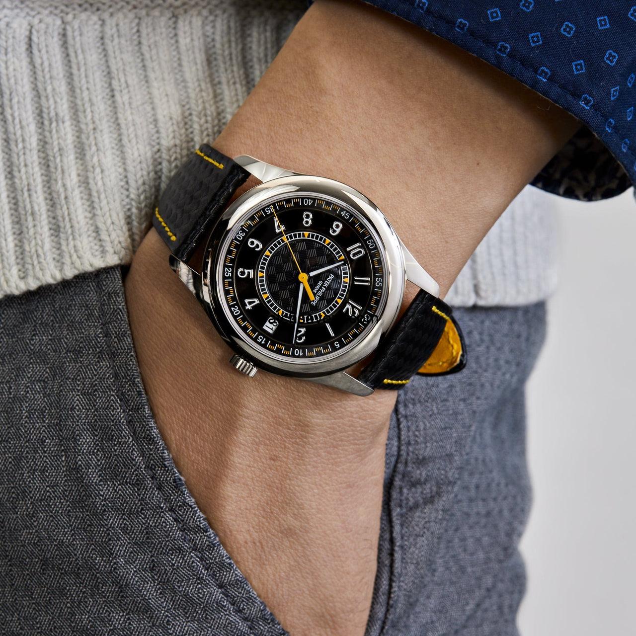 The Patek Philippe Calatrava reference 6007 was first seen in 2020 as a limited edition of 1000 pieces celebrating the new Patek Philippe production building in Plan-les-Ouates (Geneva), with a blue dial cased in stainless steel. The watch returned in 2023 as reference 6007G, which is cased in white gold. The black dial has touches of yellow (6007G-001), red (6007G-010) or sky blue (6007G-011).
