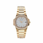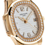 The Patek Philippe Nautilus 7010/1R-011 features a rose gold case (32mm) with a diamond-set bezel. The silvery white dial features applied gold hour markers. It is powered by the quartz caliber E23-250 S C.