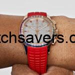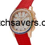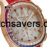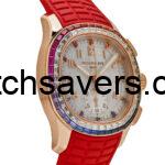 The Patek Philippe Aquanaut Chronograph 7968/300R-001was introduced in 2022 as the brand’s first self-winding ladies’ chronograph. This version has a White Gold case, with the bezel set with a rainbow consisting of baguette diamonds and multi-colored sapphire that are invisibly set. It is powered by caliber CH 28-520 C.