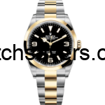 Introduced in 2021, the Rolex Explorer reference 124273-0001 has both case and bracelet done in a combination of stainless steel and yellow gold. The dial is black.
