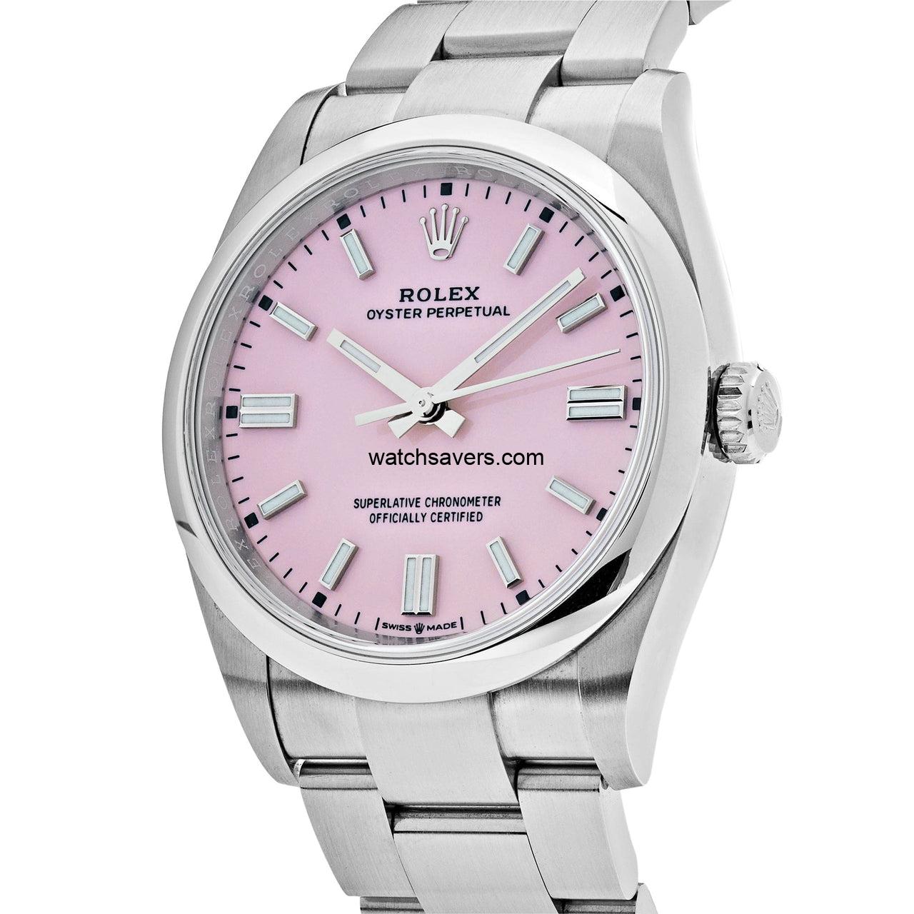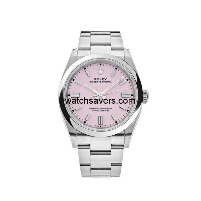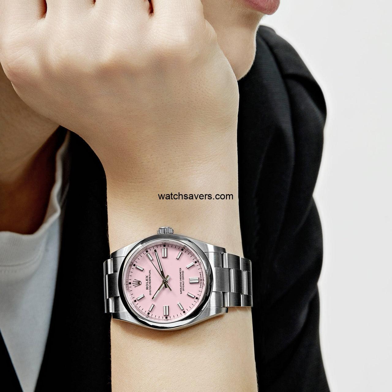 The Rolex Oyster Perpetual 36 reference 126000-0008 was introduced in 2020. This watch has a Stainless Steel case of 36.00mm, which holds the self-winding caliber 3230. The dial is Pink.