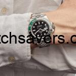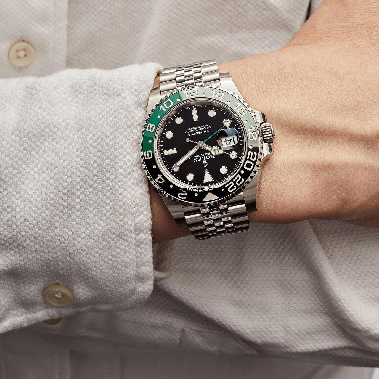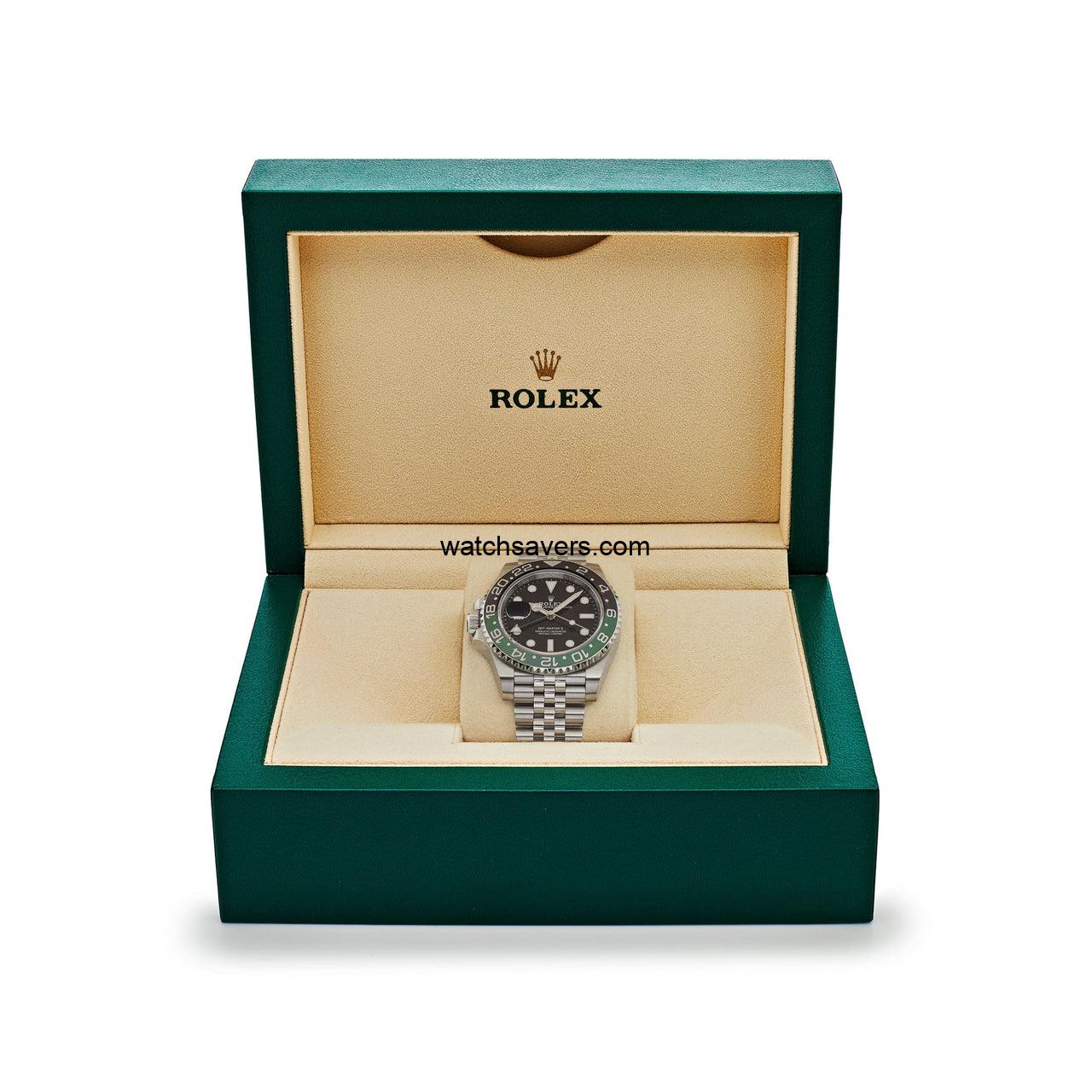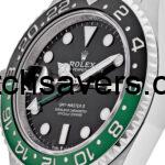 The Rolex GMT-Master II 126720VTNR-0002 was introduced in 2020. This GMT-Master has both crown and date at 9:00, and features a ceramic insert in green and black.