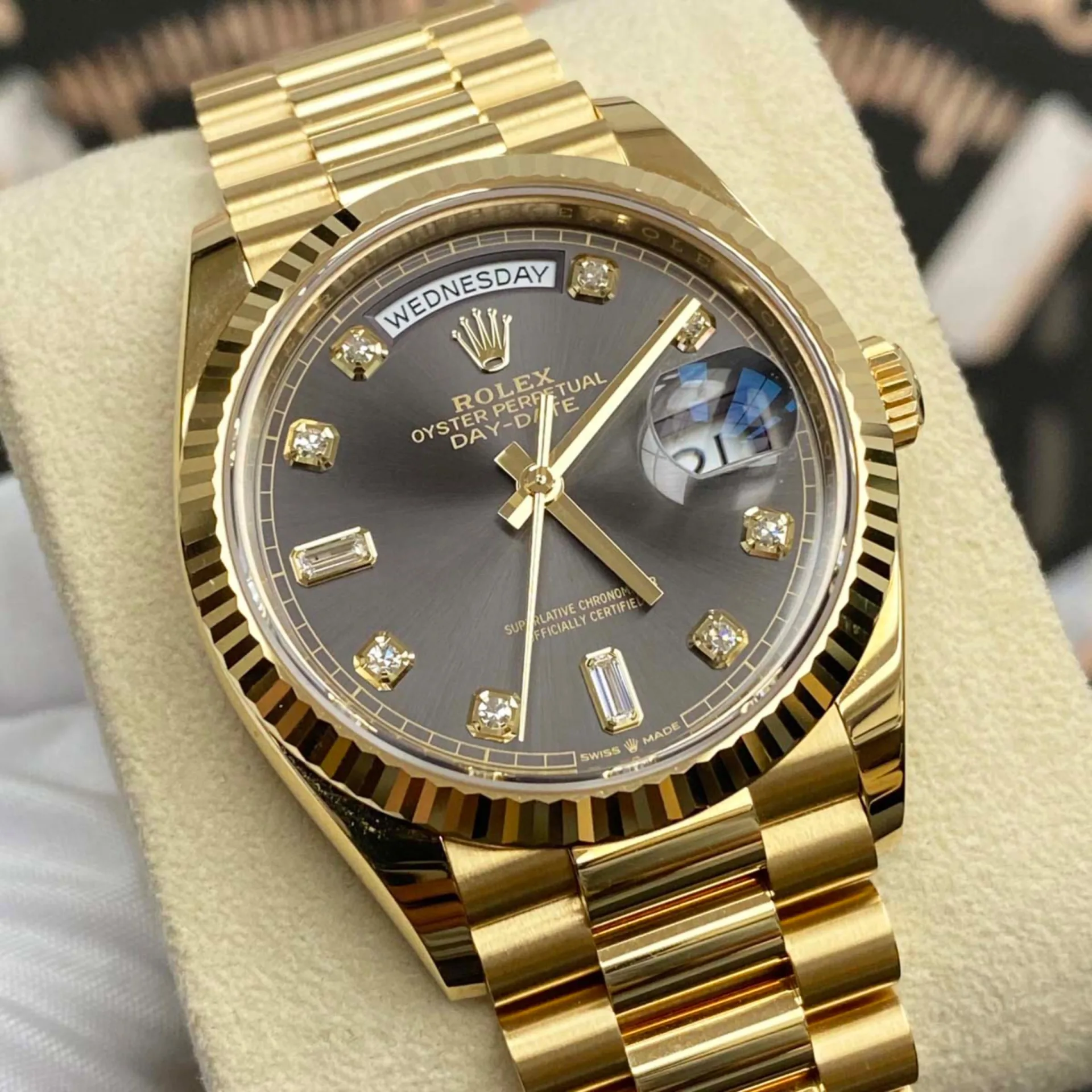 Rolex – 128238-0022 Day-Date 36 Yellow Gold / Fluted / Dark Grey-Diamond / President